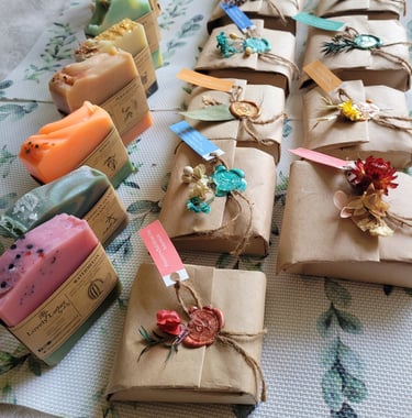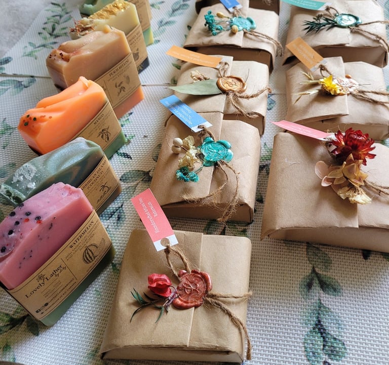 Lovely Lather's bar are individually labelled, wrapped and stamped to perfection. Avoiding the use of plastic. We use recycled kraft paper, twine and wax stamp made of Shellac resin made from Lac Beetles (eco-friendly) and a small amount of glue. Each bar is stamped with different type of botanicals base on the season and availabilities. No bar is the same. But each bar is Special.